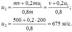 Снаряд, летевший со скоростью v = 400 м/с, в верхней точке траектории разорвался на два осколка. Меньший осколок, масса которого составляет 40% от массы снаряда, полетел в противоположном направлении со скоростью u1 = 150 м/с. Определить скорость u2 большего осколка.